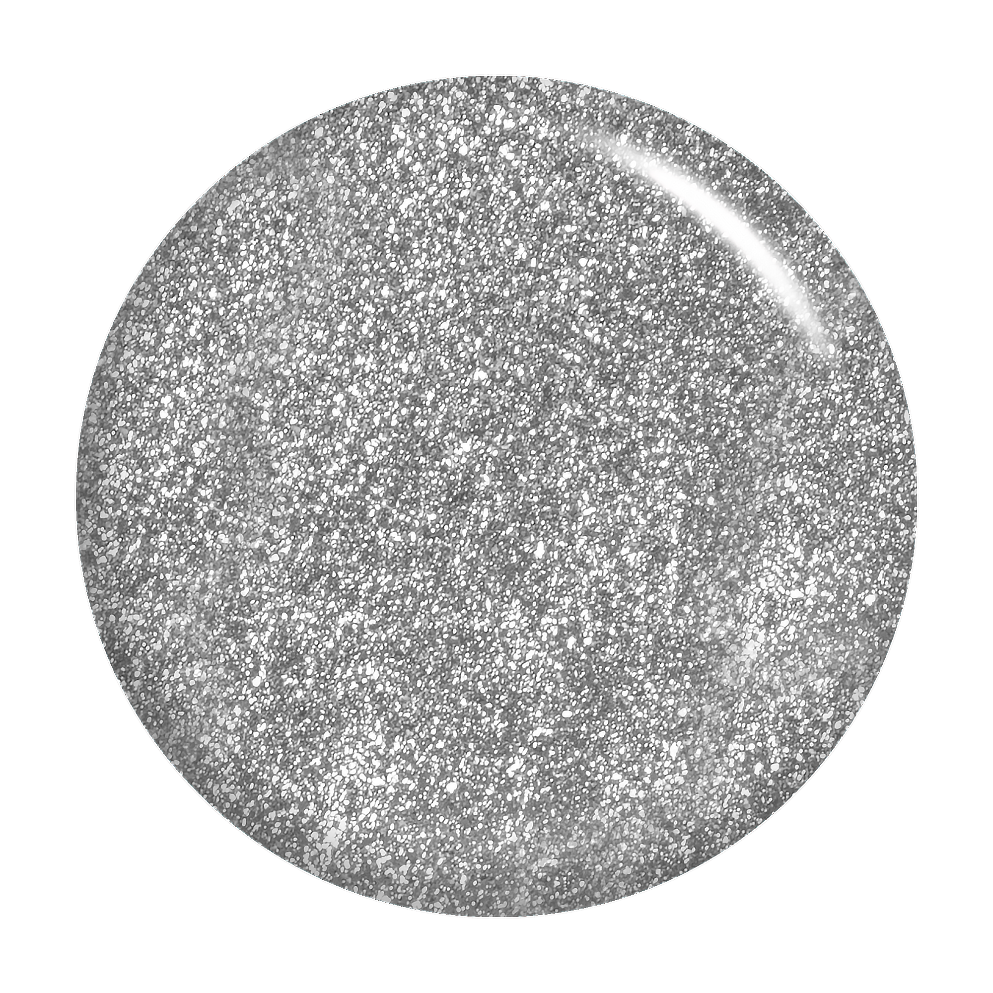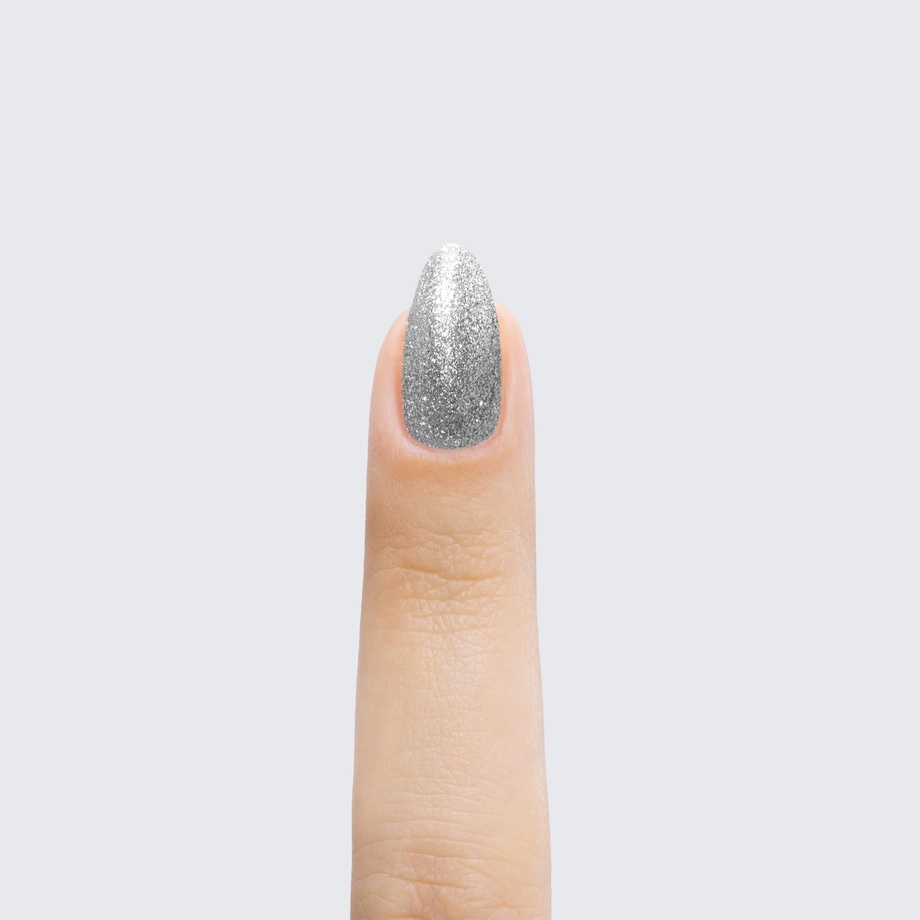 Silver. Metallic foil sparkle. Opaque. Cool undertone.